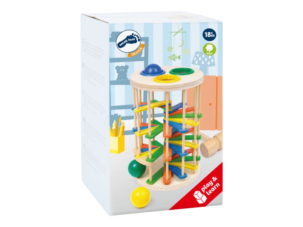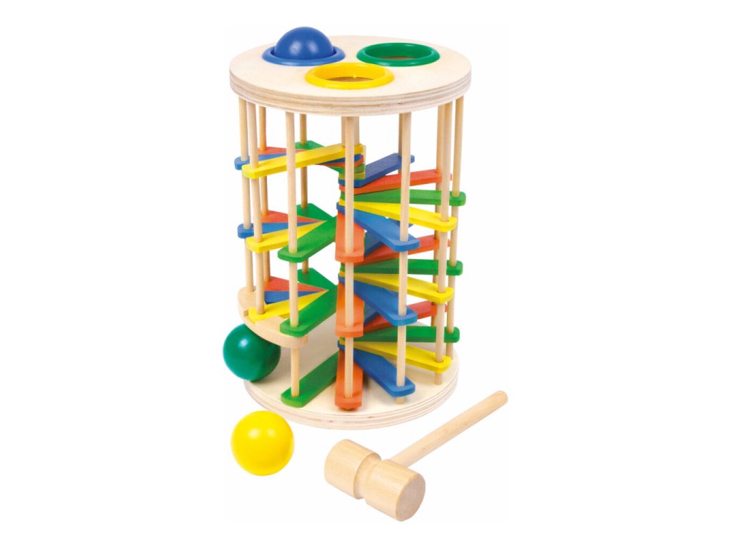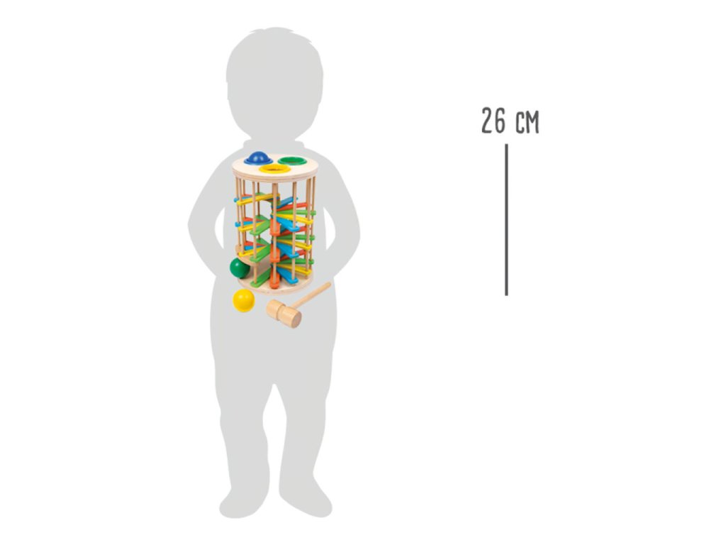 Zábavná hra, kde děti zatloukají 3 barevné koule o průměru 4,5 cm přes plastové kroužky, které pak padají dolů po barevném dřevěném schodišti a vydávájí tak cvakavý zvuk. Věž fascinuje všechny děti, jejich sluch i zrak a zlepšuje i jejich motorické schopnosti! Hlavní vlastnosti: barevný designzábavná hrarozvíjí motoriku dětí