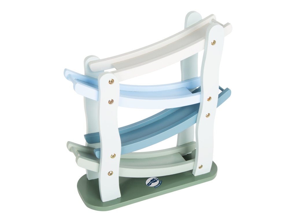 Na značky, připravit, start! Tato dřevěná kaskádová závodní dráha nabízí prostor pro změření rychlosti 4 autíček. Z jednoho patra na druhé, autíčka dělají přemety a jen koukat na ně je zábavné. Dráha je vyrobena z přírodního a bílého dřeva, jedno autíčko je přírodní, zbylé 3 jsou barevné. Hračka rozvíjí motoriku dětí, také koordinaci ruka-oko. Hlavní vlastnosti Klasický design v modrošedé barvěOboustranná autíčka s pogumovanými kolyRozvíjí motoriku a koordinaci ruka-oko