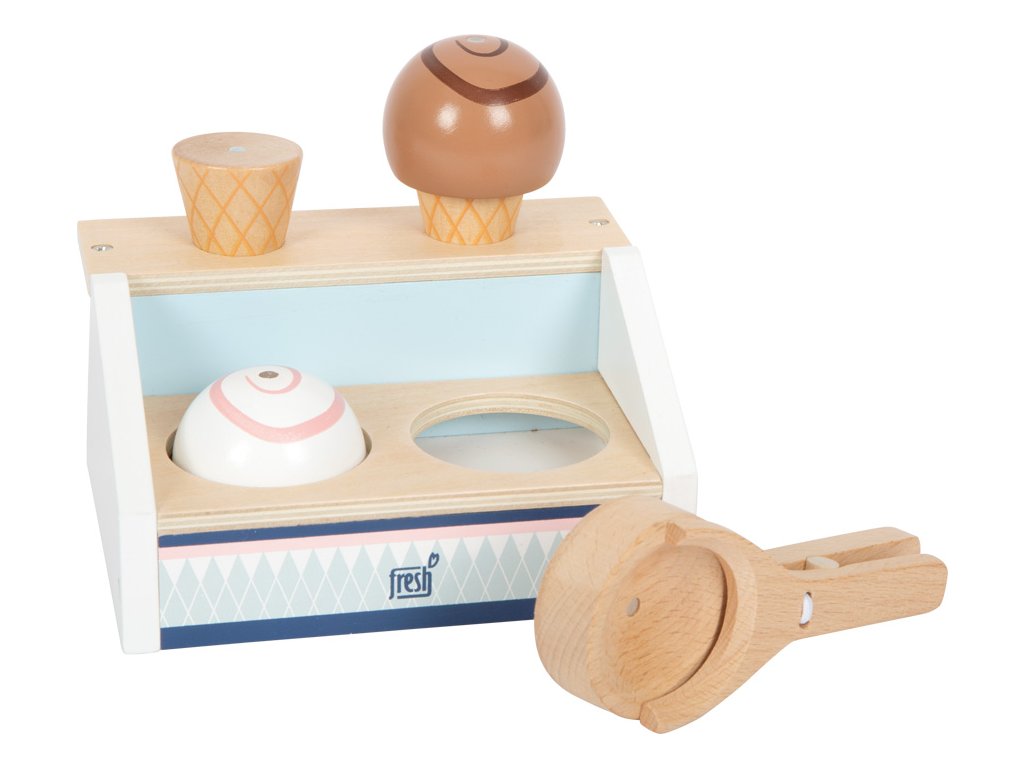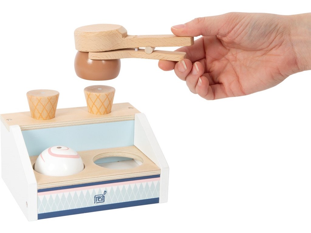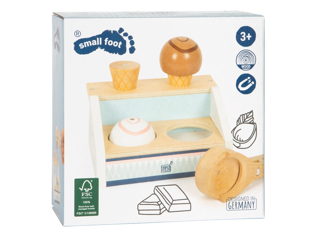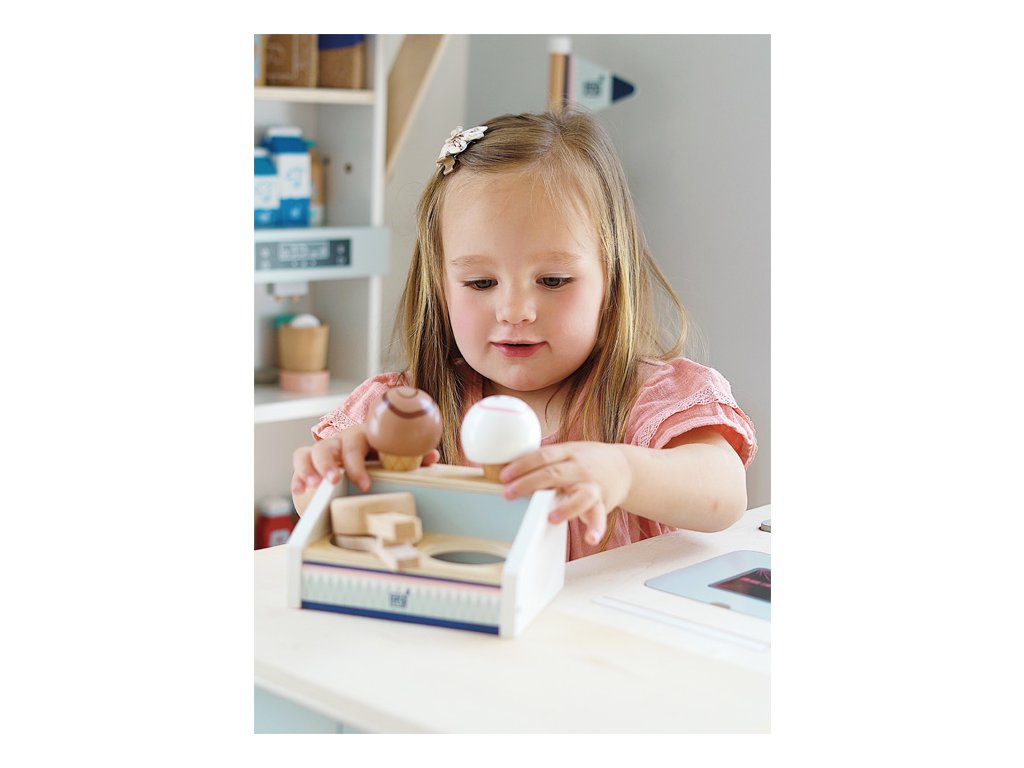 Dnes máme zmrzlinu! Tento displej se dvěma přihrádkami se díky svému minimalistickému designu a přírodního materiálu báječně hodí do malých kuchyněk každého dětského pokojíku! Obsahuje naběračku, kornoutky a stohovatelné kopečky zmrzliny (tyto kopečky lze díky jejich magnetům také stohovat). Vrcholem herní sady je magnetická naběračka na zmrzlinu – pouhým stisknutím tlačítka můžete zmrzlinu postavit na kornout! Hlavní vlastnosti: genderově neutrální barevné schémavhodný doplněk k produktům LE11815, LE12417 či LE12232naběračka, kornoutky a stohovatelné kopečky zmrzliny mají magnetyhra podporuje komunikační dovednosti a kreativitu
