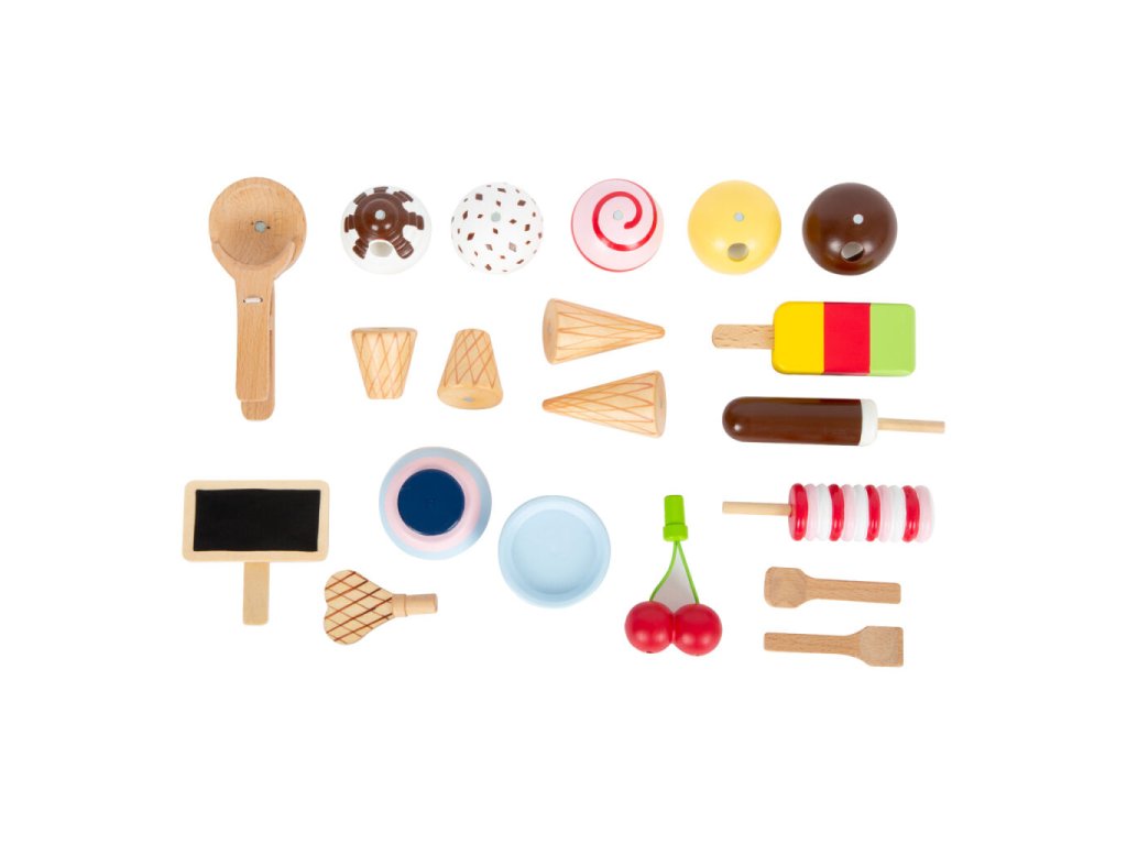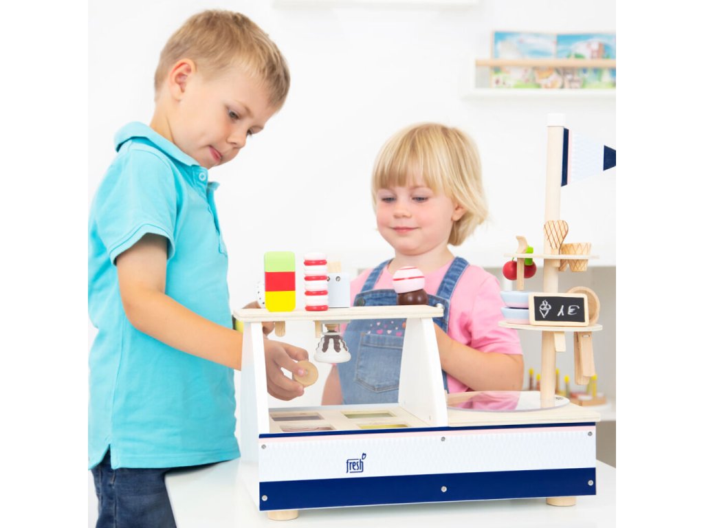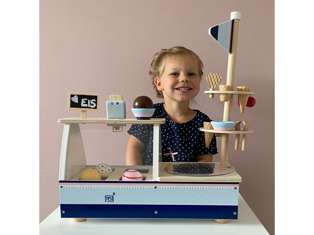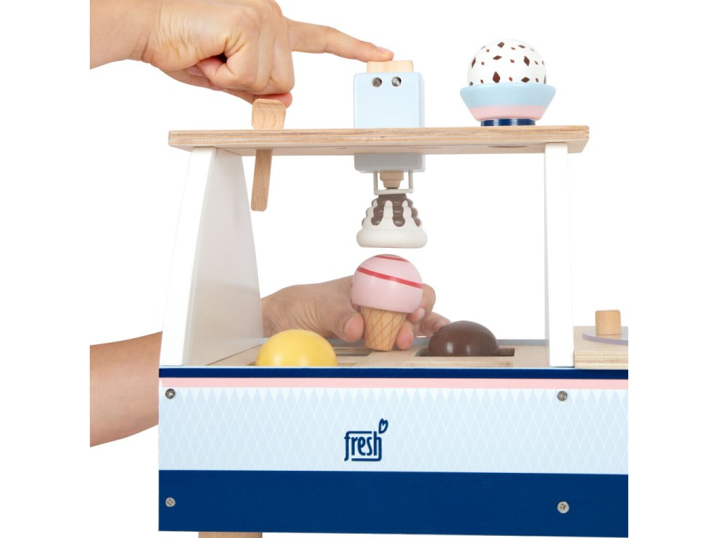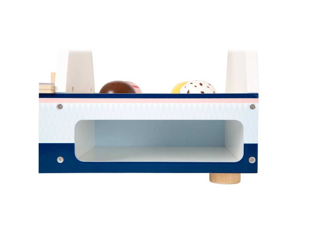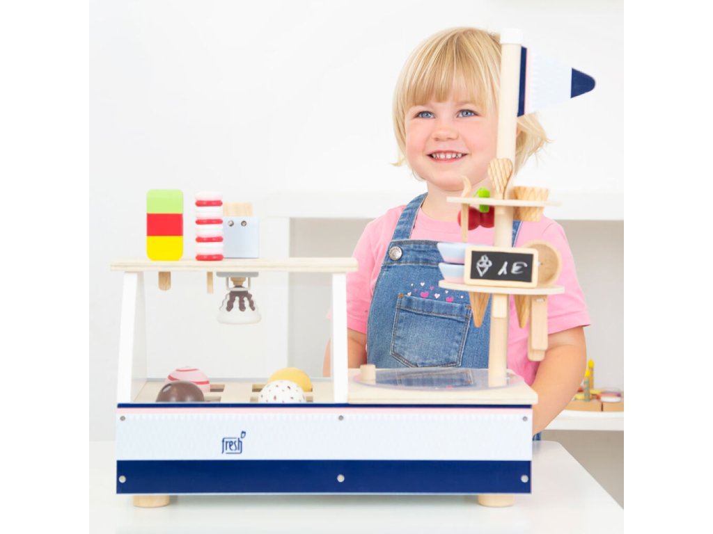 Jdeme na zmrzlinu! Tento dřevěný zmrzlinový set je perfektní na léto i zimu. Zmrzlinový stánek je modro-růžový, má také prvky přírodního dřeva, zákazníky nadchne velkým výběrem dezertů a svými funkcemi a příslušenstvím. Můžete si dát více kopečků zmrzliny, nanuk, točenou zmrzlinu, poháry, wafle... a to vše ozdobit třešničkou. Stánek má také plastovou vitrínu, mrazničku s plastovým poklopem, stojan na kornouty. Kopečky zmrzliny a točená zmrzlina jsou magnetické, v balení také najdete tabulku, na kterou můžete psát křídou. Zmrzlinu (vanilku, čokoládu, stracciatellu a jahodu) můžete z vitríny vyndat a dát ji do misky nebo kornoutu. Všechny se také vejdou na wafli. Vytvořte si dezert dle svého gusta. Zmrzlinový stánek má také úložný prostor. Hlavní vlastnosti Zmrlinové kopečky a točená zmrzlina s magnetyOsm různých příchutí zmrzliny, nanukyKopečky se dají skládat na sebe díky magnetůmVelké a malé zmrzlinové kornouty, misky se lžícemi, wafleStánek s plastovou vitrínou, mraznička s průhledným poklopemGenderově neutrální, jemný design