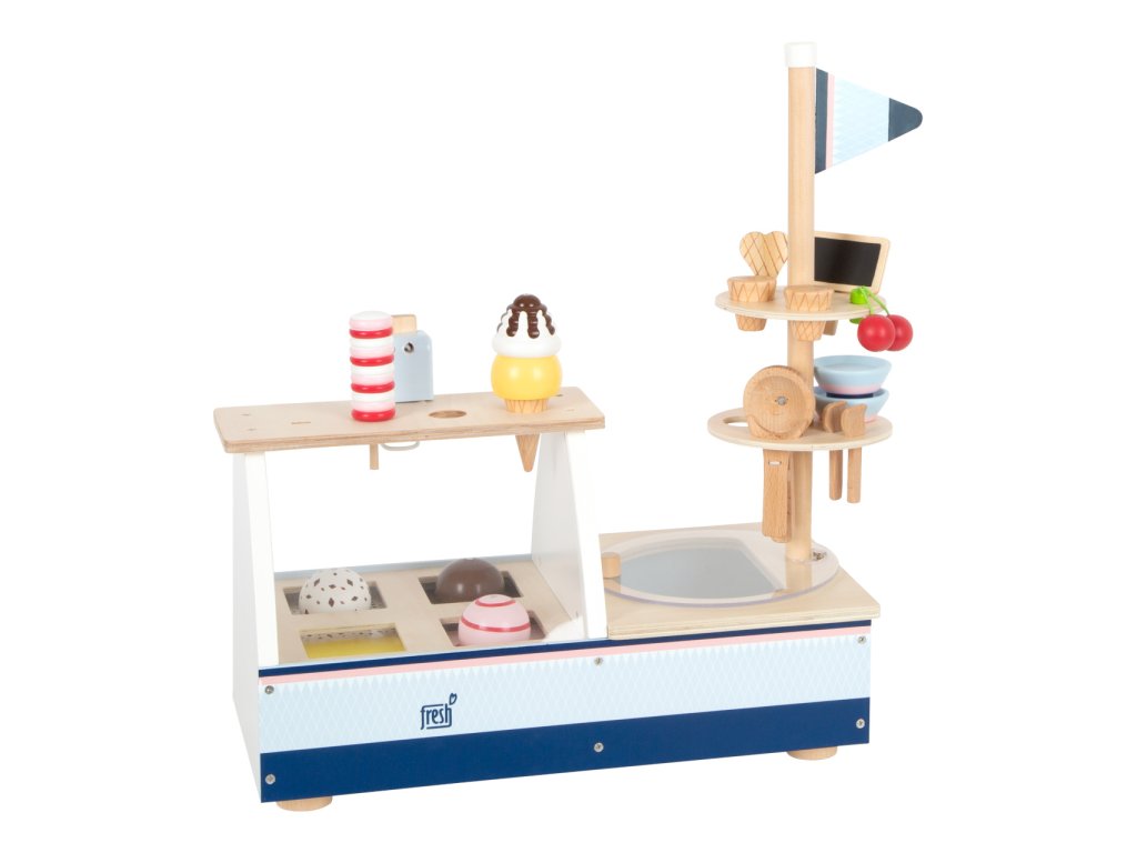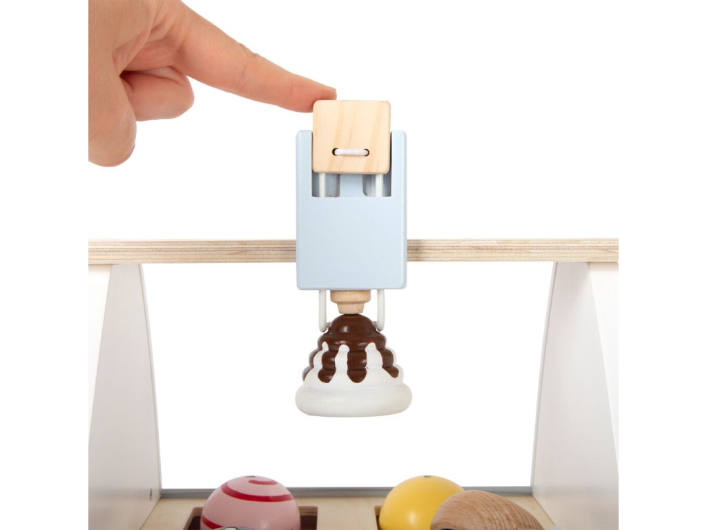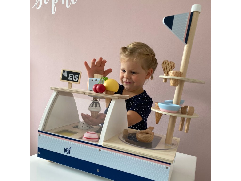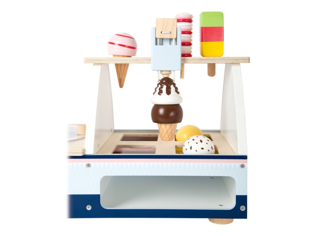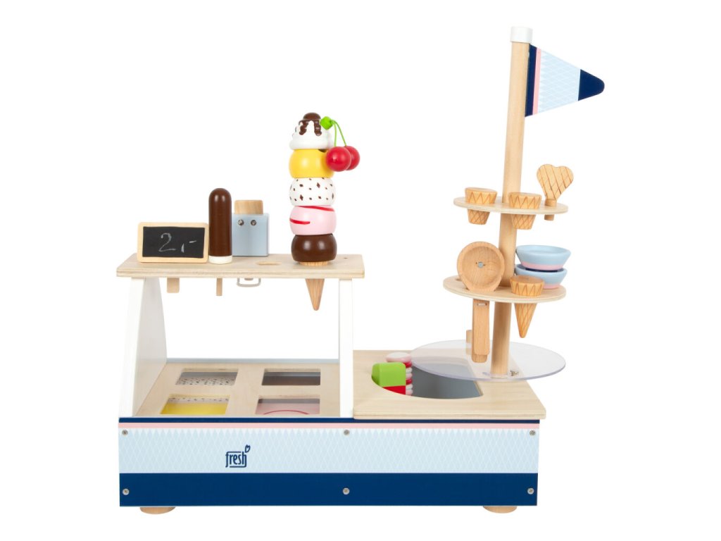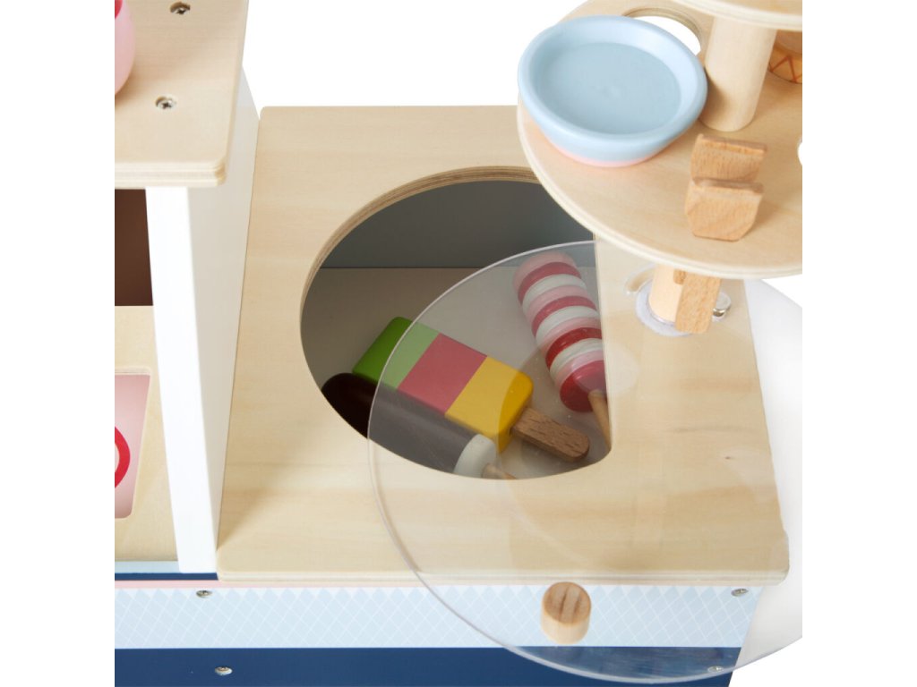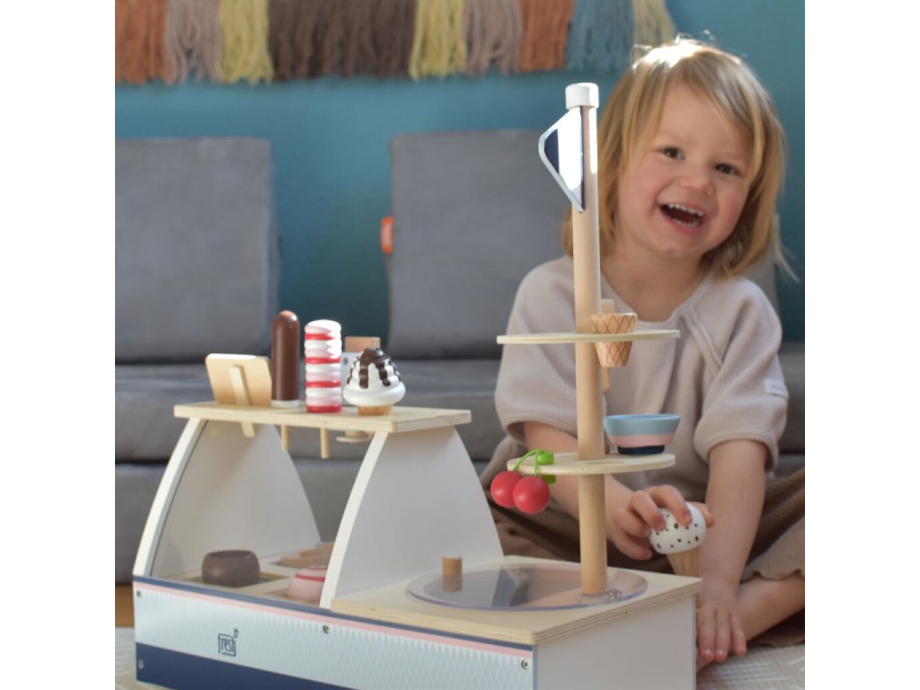 Jdeme na zmrzlinu! Tento dřevěný zmrzlinový set je perfektní na léto i zimu. Zmrzlinový stánek je modro-růžový, má také prvky přírodního dřeva, zákazníky nadchne velkým výběrem dezertů a svými funkcemi a příslušenstvím. Můžete si dát více kopečků zmrzliny, nanuk, točenou zmrzlinu, poháry, wafle... a to vše ozdobit třešničkou. Stánek má také plastovou vitrínu, mrazničku s plastovým poklopem, stojan na kornouty. Kopečky zmrzliny a točená zmrzlina jsou magnetické, v balení také najdete tabulku, na kterou můžete psát křídou. Zmrzlinu (vanilku, čokoládu, stracciatellu a jahodu) můžete z vitríny vyndat a dát ji do misky nebo kornoutu. Všechny se také vejdou na wafli. Vytvořte si dezert dle svého gusta. Zmrzlinový stánek má také úložný prostor. Hlavní vlastnosti Zmrlinové kopečky a točená zmrzlina s magnetyOsm různých příchutí zmrzliny, nanukyKopečky se dají skládat na sebe díky magnetůmVelké a malé zmrzlinové kornouty, misky se lžícemi, wafleStánek s plastovou vitrínou, mraznička s průhledným poklopemGenderově neutrální, jemný design