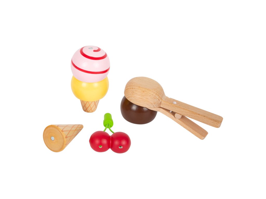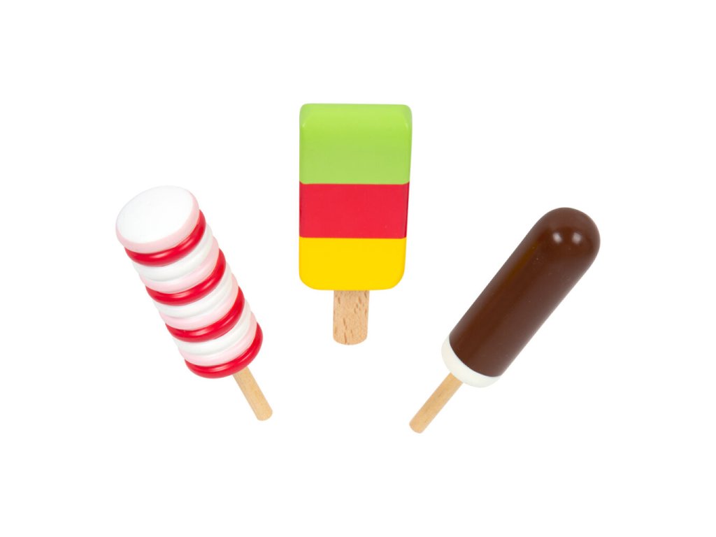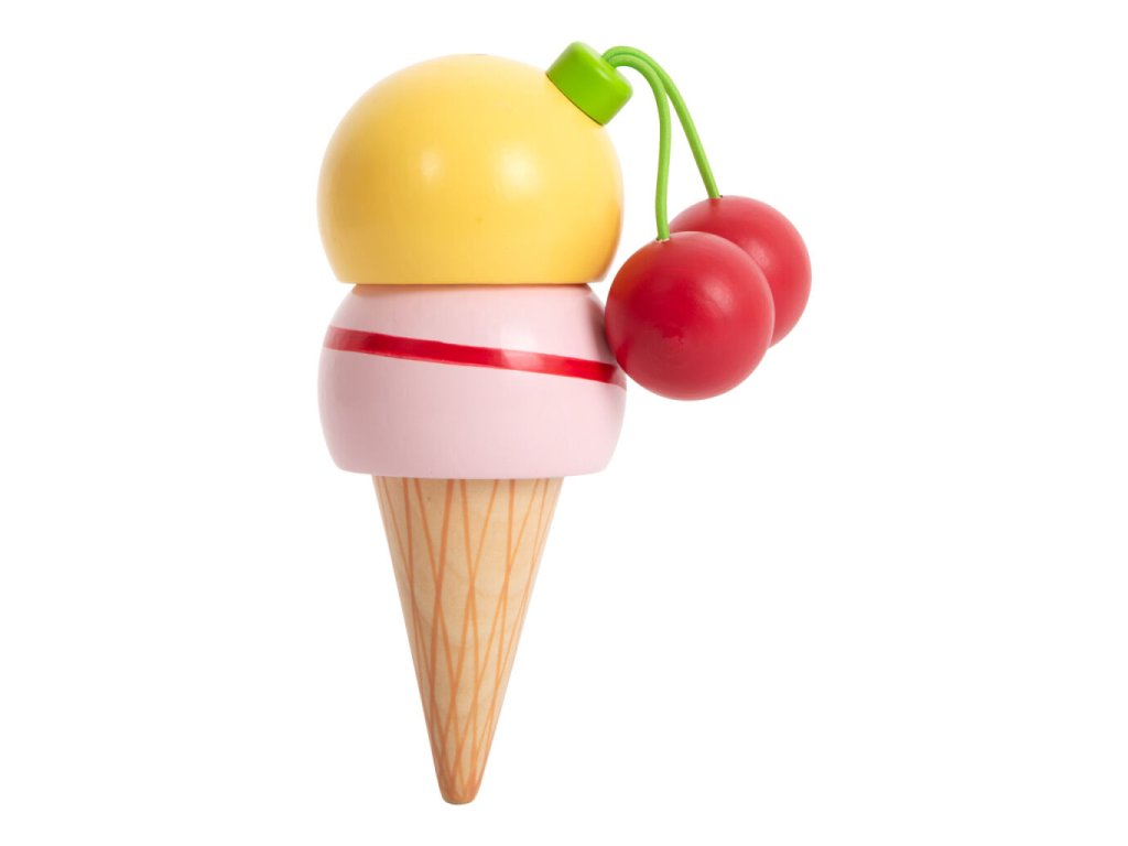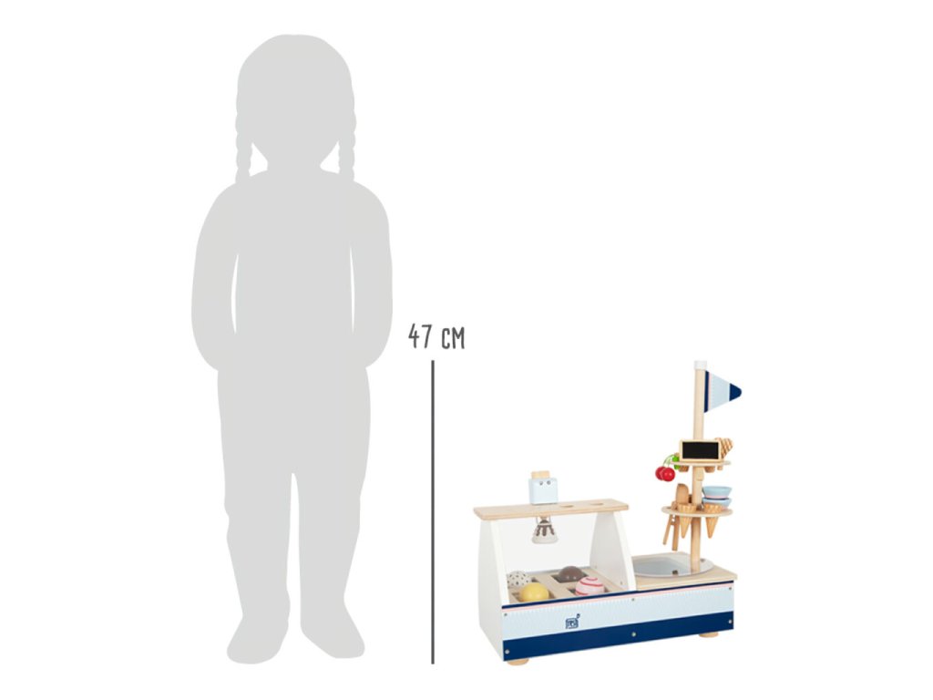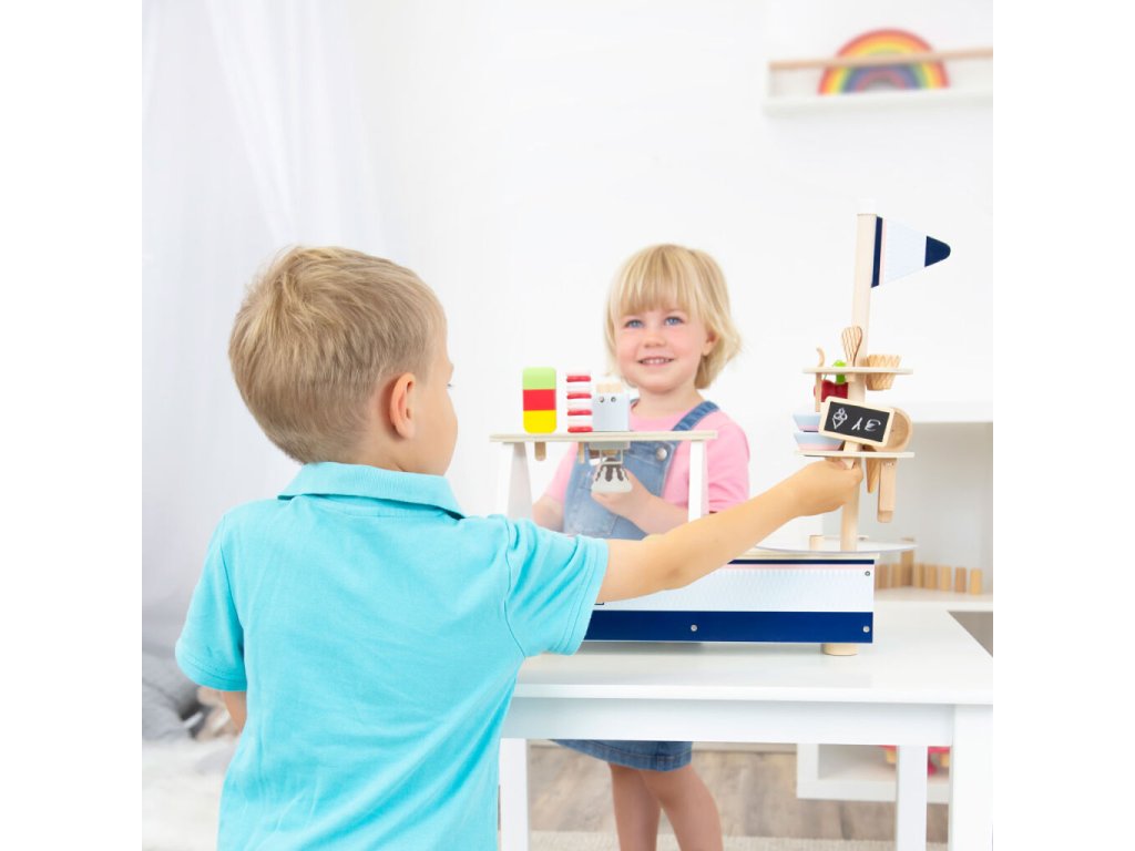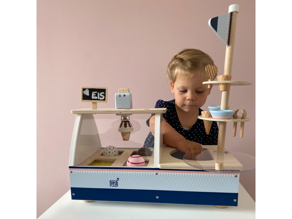 Jdeme na zmrzlinu! Tento dřevěný zmrzlinový set je perfektní na léto i zimu. Zmrzlinový stánek je modro-růžový, má také prvky přírodního dřeva, zákazníky nadchne velkým výběrem dezertů a svými funkcemi a příslušenstvím. Můžete si dát více kopečků zmrzliny, nanuk, točenou zmrzlinu, poháry, wafle... a to vše ozdobit třešničkou. Stánek má také plastovou vitrínu, mrazničku s plastovým poklopem, stojan na kornouty. Kopečky zmrzliny a točená zmrzlina jsou magnetické, v balení také najdete tabulku, na kterou můžete psát křídou. Zmrzlinu (vanilku, čokoládu, stracciatellu a jahodu) můžete z vitríny vyndat a dát ji do misky nebo kornoutu. Všechny se také vejdou na wafli. Vytvořte si dezert dle svého gusta. Zmrzlinový stánek má také úložný prostor. Hlavní vlastnosti Zmrlinové kopečky a točená zmrzlina s magnetyOsm různých příchutí zmrzliny, nanukyKopečky se dají skládat na sebe díky magnetůmVelké a malé zmrzlinové kornouty, misky se lžícemi, wafleStánek s plastovou vitrínou, mraznička s průhledným poklopemGenderově neutrální, jemný design