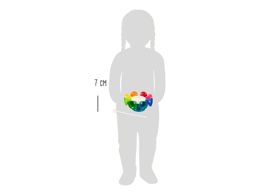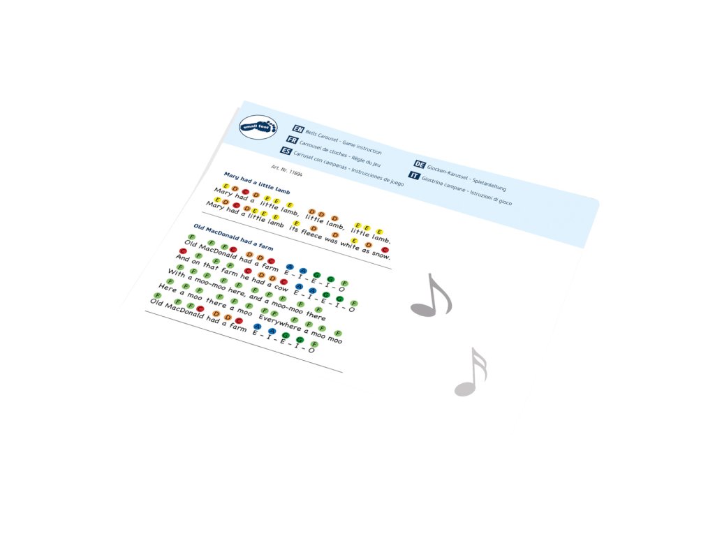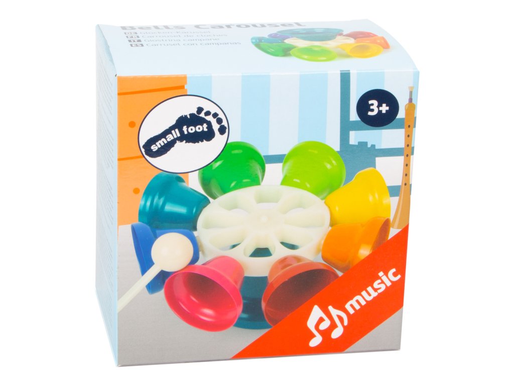 Jiná barva, jiný zvuk! Tento kolotoč má osm barevných zvonečků, každý z nich je naladěn na jinou notu – C, D, E, F, G, A, H, C. Zvoneček můžete držet v ruce nebo jej nechat na stojanu. Paličkou můžete hrát podobně jako na xylofon. V balení naleznete také noty s 8 různými skladbami pro začátečníky a malé děti – noty jsou zaznačeny i barevně. Hudební set podporuje u dětí rozvoj rytmu, hudebního sluchu a také koordinace ruka-oko. V notách najdete písničky jako „Strýček Donald farmu měl“, „Rolničky“, „Třpyť se, hvězdičko“. Perfektní také do školek, prvních stupňů základních škol. Hlavní vlastnosti: osm barevných zvonečků = osm tónůrozvíjí talent dětí, cit pro rytmus a melodiisoučástí balení noty s osmi písněmi