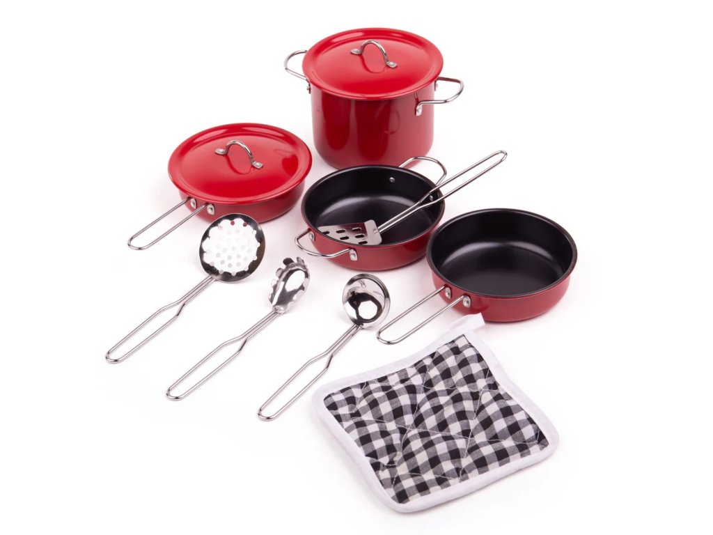 Mladí nastávající kuchaři jistě toto vybavení kuchyně ocení. Set o 11 kusech obsahuje 2 hrnce a 2 pánve, 3 typy naběraček a obracečku a chňapku. Všechno nádobí bylo zmenšeno, aby s ním mohly dobře pracovat i malé dětské ruce. Skvělý způsob jak děti naučit vařit různá jídla a dodržovat bezpečnost v kuchyni. Podporuje kreativní a představivou hru. Rozvíjí koordinaci ruka-oko, jemnou motoriku a zručnost. Odpovídá evropské bezpečnostní normě. Hlavní vlastnosti: set o 11 kusechpodporuje kreativitu a představivost