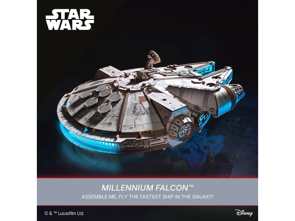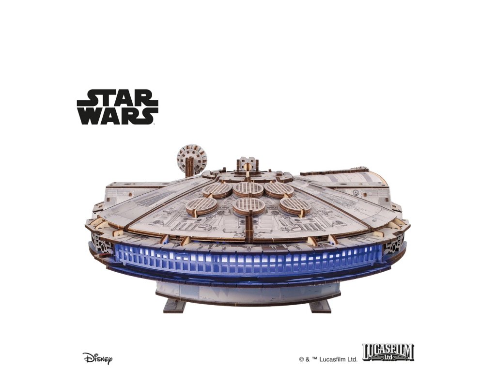 Postavte si legendární loď Millennium Falcon, ve které létal Han Solo a jeho posádka. Má modrá LED světla jako hyperpohon, otevírací střechu, nákladový prostor a rampu, pohyblivé dělostřelecké věže a anténu otočnou o 360°. Nechybí ani propracované detaily interiéru a exteriéru.Poskládejte a pilotujte nejrychlejší loď v galaxii! Proleťte Kessel Run za méně než dvanáct parseků s touto skládačkou z Ugears oficiální kolekce Star Wars.Model milované lodi Hana Sola a Chewbaccy v měřítku 1 : 75 je jedním z nejdetailnějších modelů. Millennium Falcon, klíčová stíhačka v nejzásadnějších bitvách proti Galaktickému impériu, prošla rukama řady zločinců, než byla nakonec ukradena a pilotována Rey ve filmu Síla se probouzí (2015), než ji Han a Chewie získali po tolika letech konečně zpět do svých rukou.Má detailní barevné prvky v interiéru i exteriéru, vypadá jako opravdová loď, kterou znají všichni fanoušci z filmů Star Wars. Hyperpohon simulují modrá LED světla, které jsou napájená bateriemi, ty však nejsou součástí balení.Mezi pohyblivé prvky patří dveře nákladového prostoru, rampa, podvozek, dělostřelecké věže, anténa otočná o 360° a zatahovací střecha, která se otevírá na části a umožňuje zobrazit opravdu detailní a realistický interiér lodi. Dřevovláknitá deska s vysokou hustotou a karton dodávají lodi větší odolnost a zajímavý vzhled. Postavte si kus filmové historie, postavte si impozantní 3D model lodi Millennium Falcon. Hlavní vlastnosti: Star Wars model s modrými LED světly jako hyperpohontlačítko zapíná/vypíná LED světla napájená bateriemi (nejsou součástí balení)otevírací střechaotevírací nákladový prostor s pohyblivou rampoupohyblivé dělostřelecké věžeanténa otočná o 360°detailní zpracování interiéru a exteriérubarevné dílky dodávají realistický nádechdřevovláknitá deska s vysokou hustotou pro větší odolnoststojan na vystavenímontáž bez lepidla a nástrojůobsahuje 1235 dílkůvysoká obtížnost