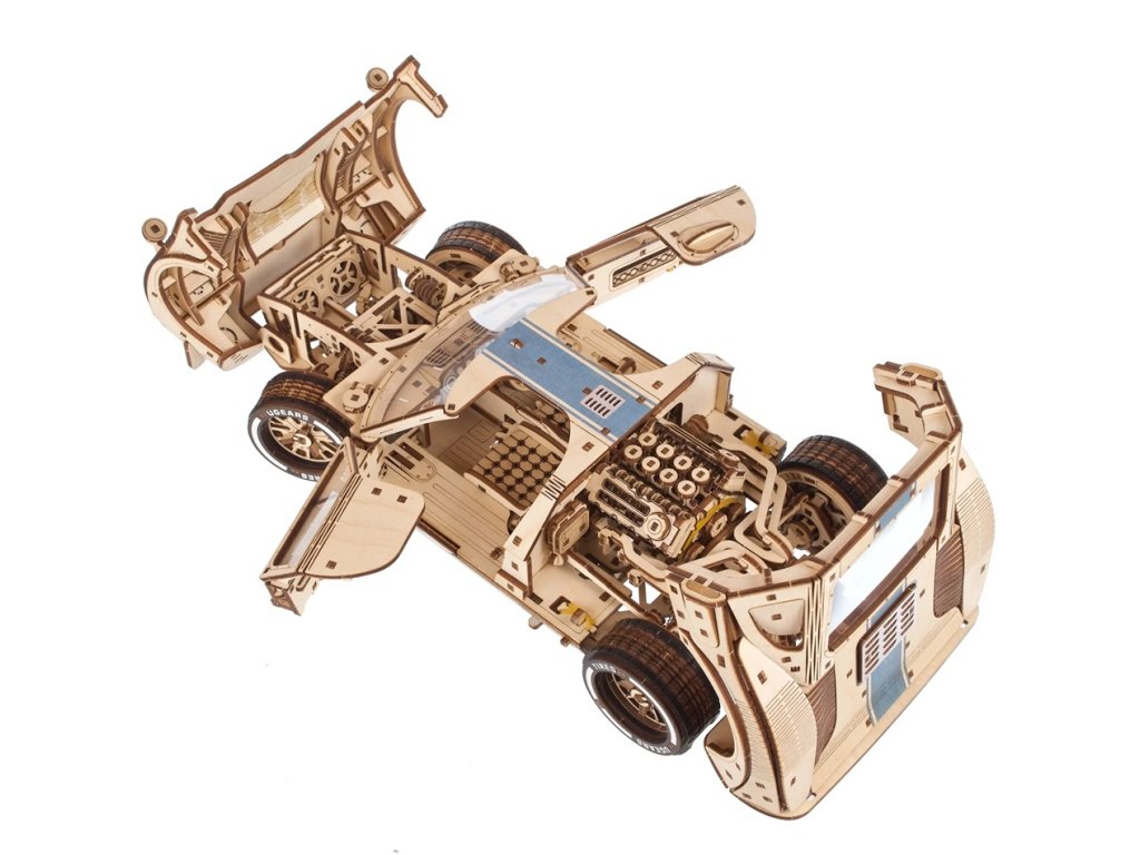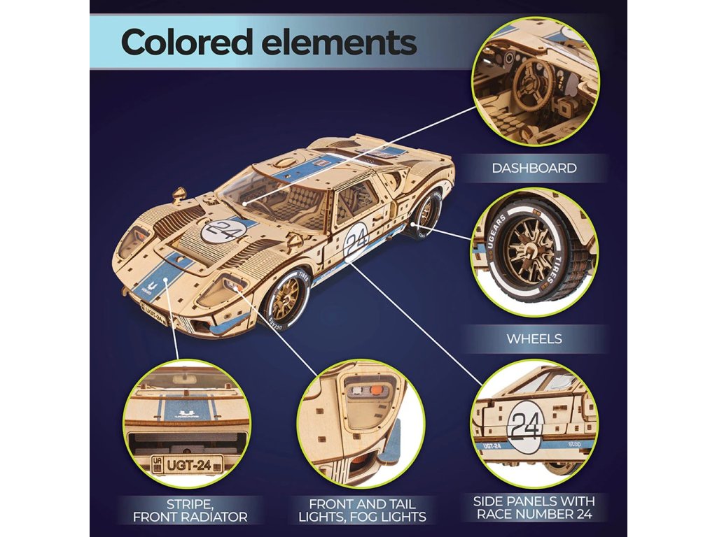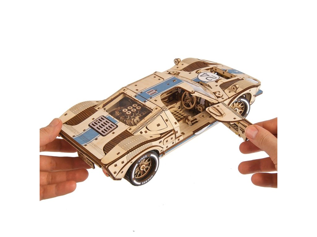 GT-24 Endurance Racer je dřevěný model v měřítku 1 : 12 inspirovaný ikonickými závodními vozy z 60. let minulého století. Toto dvoudveřové sportovní kupé potěší každého motoristického nadšence detailním zpracováním a mnoha funkčními prvky, jako jsou plné odpružení, otevírací kapota a kufr, zamykací dveře, silikonové pneumatiky pro extra přilnavost, barevné závodní pruhy a okna, motor V8 s pohyblivými písty a řadicí páka s režimy vpřed, vzad a sport pro extra zrychlení. Mezi pohyblivé části tohoto modelu patří ventilátor chladiče, ruční brzda, víčko palivové nádrže a zamykatelné dveře. Vyjměte z kufru klíč, zasuňte jej do mechanismu pod podvozkem, přepněte spínač stop/start nebo zařaďte neutrál, abyste mohli pozorovat pohybující se písty. Závodní vůz je schopen ujet 5 až 6 metrů. Skládačka je dodávána v nesloženém stavu, zabalená v krabici s podrobným návodem k sestavení v 11 jazycích. Všechny dílky jsou přesně vyřezané a lehce do sebe zapadnou bez použití lepidla či nástrojů, aby výsledek byl stabilní a odolný. Hlavní vlastnosti: 970 dílkůvysoká obtížnost sestavenífunkční řadicí páka s převody vpřed, sportovní, neutrál a zpátečkavíceprvkové pružinové zavěšení na všech čtyřech kolechpružinový motor s natahovacím klíčemotevírání kapoty a zavazadlového prostoru, pohyblivá ruční brzda a stěrače čelního sklapohyblivé písty motoru V-8 a ventilátor chladičefunkční volantaerodynamický design s realistickými detailymodrý závodní pruh a plastová oknasestavení bez lepidla a nářadípodrobný návod k sestavení v 11 jazycíchnavrženo a vyrobeno na Ukrajině