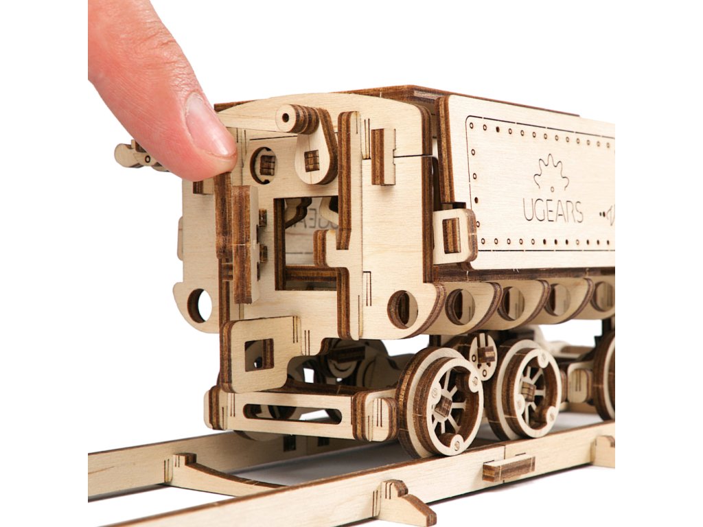 Plnou parou průmyslovou revolucí. Stavebnice parní lokomotivy s tendrem vyrobená z překližky. Tendr má odklápěcí boky a nabízí úložný prostor i pro případ, že model bude stát ve vitríně. Mechanika je do detailu propracovaná, vy tak můžete pozorovat pohyb klikového mechanismu dvojkolí modelu. Lokomotiva je zbavena pláště, a lze tak pozorovat i chod soukolí uvnitř. Díky natahovacímu mechanismu je model schopen jízdy, na jedno natažení urazí až 4 metry. Má funkční převodovku pro volnoběh a zpátečku. Může se pyšnit dalšími mechanickými podrobnostmi, dveřmi kabiny strojvedoucího, dvířky topeniště a střešní ventilace, nebo i spřáhlem. Lokomotiva je posazena na až 2 metry dlouhém rovném úseku tratě. Mezi nabízeným traťovým příslušenstvím naleznete model nástupiště, s nímž prohloubíte celkový zážitek ze stavby a provozu modelu. Uspořádejte závody s dalšími modely UGEARS! Vybaveno detailním návodem k sestavení. Hlavní vlastnosti: 538 precizně vyřezaných dílkůvysoká obtížnost sestaveníúložný prostormnožství mechanických detailůrozšiřitelný o model nástupištěvýsledný model je schopný samostatné jízdy včetně zpátečkynavrženo a vyrobeno na Ukrajině