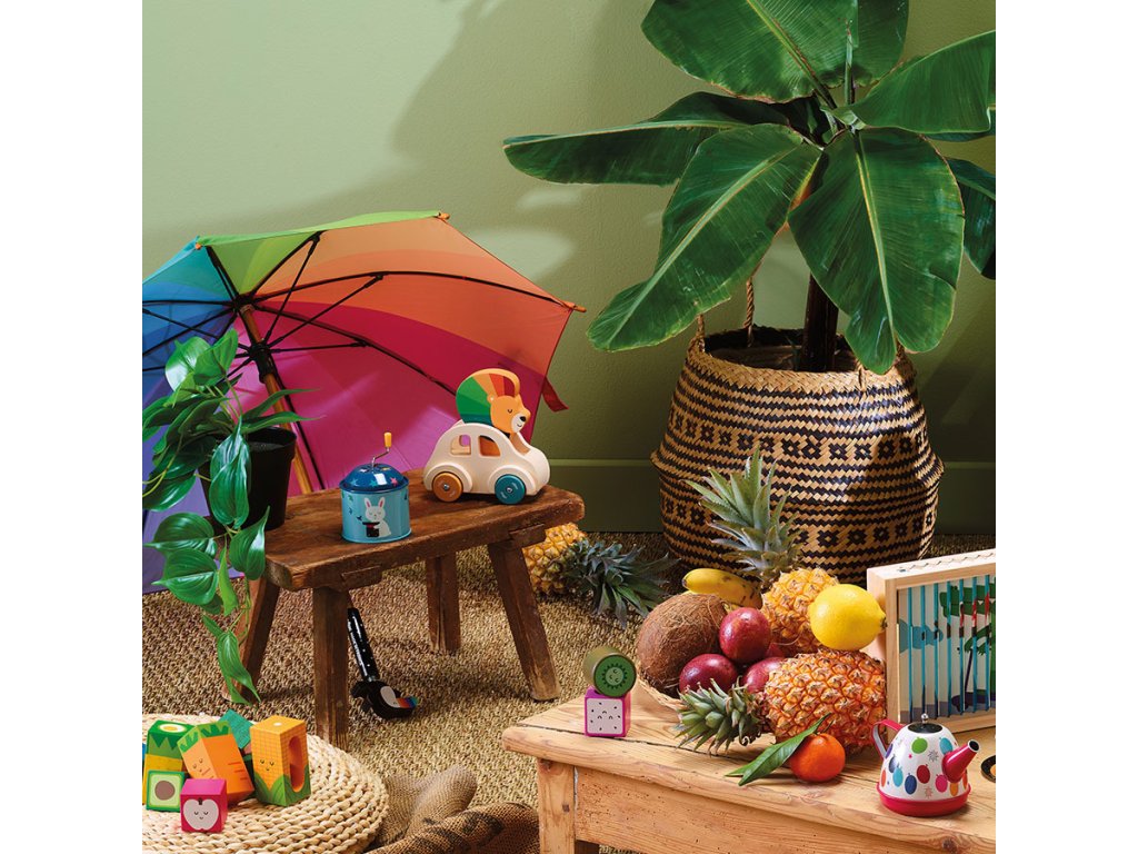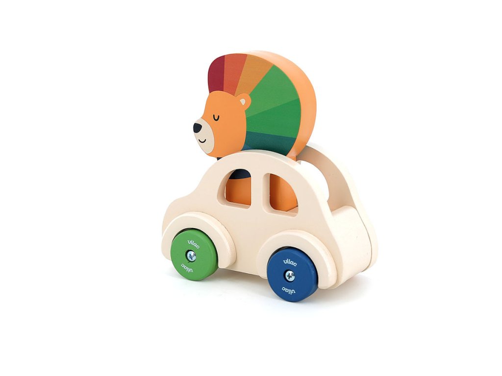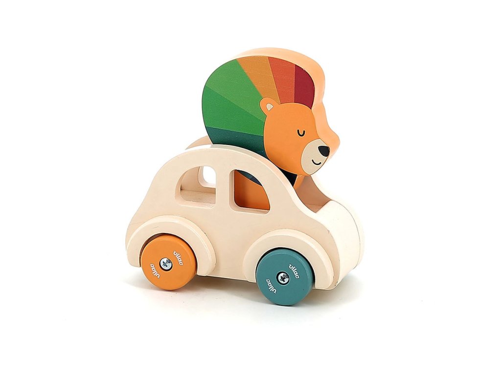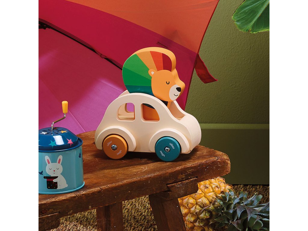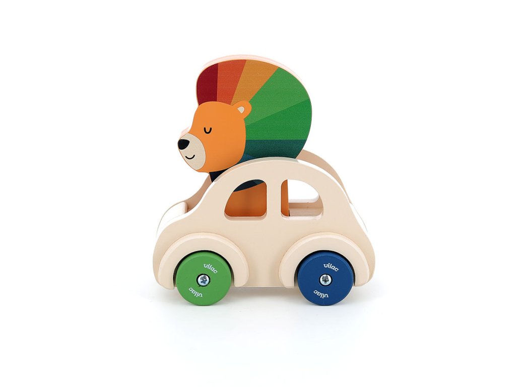 Dřevěné autíčko v přírodní barvě s barevnými koly, ve kterém sedí rozkošný lvíček s barevnou hřívou. Pod lvíčkem je zabudován klakson, proto když dítko zatlačí na hlavu lvíčka, ozve se zatroubení. Tento zvukový detail stimuluje zájem batolat a zároveň jim poskytuje přímou interakci s hračkou. Hračka je dokonale přizpůsobena pro malé ruce a rozvíjí fantazii, jemnou motoriku a koordinaci ruka-oko. Hlavní vlastnosti: ilustrace Andy Westfacehračka s klaksonemrozvíjí jemnou motoriku, objevování a pozorovánípodporuje kreativitu a motivuje k představivé hře Andy Westface je ilustrátor žijící a působící v Hongkongu. Svou prací se snaží zprostředkovat silné pocity a jasné myšlenky za pomoci jednoduchých tvarů, kompozic i barevnosti. Typickými prvky jeho děl jsou zvířata a duha, které si oblíbil pro jejich čistotu, upřímnost a schopnost vzbuzovat radost.