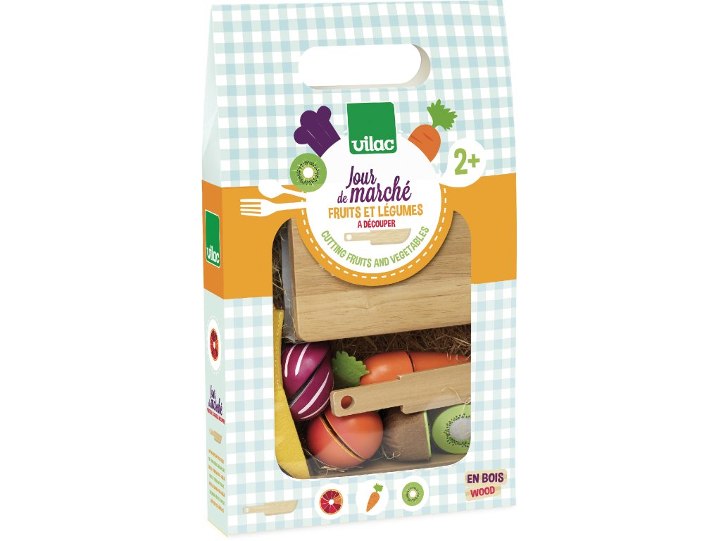 Košíček s pěti typy ovoce a zeleniny, který má v balení také krájecí desku a nůž, vše je vyrobeno ze dřeva. Skvělý doplněk do kuchyněk Vašich dětí. Hlavní vlastnosti: vhodné do každé kuchyňkypotraviny vyrobené ze dřeva