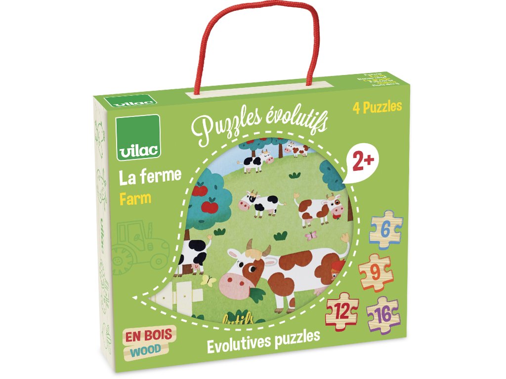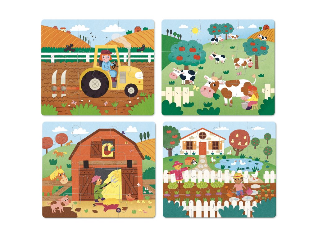 Sada čtyř vývojových puzzlí s tematikou farmy. Puzzle mají zvyšující se obtížnost – 6, 9, 12 a 16 dílků. Zabaleno v boxu s bavlněnou rukojetí. Hlavní vlastnosti: 4 puzzle po 6, 9, 12 a 16 dílcích praktický úložný box