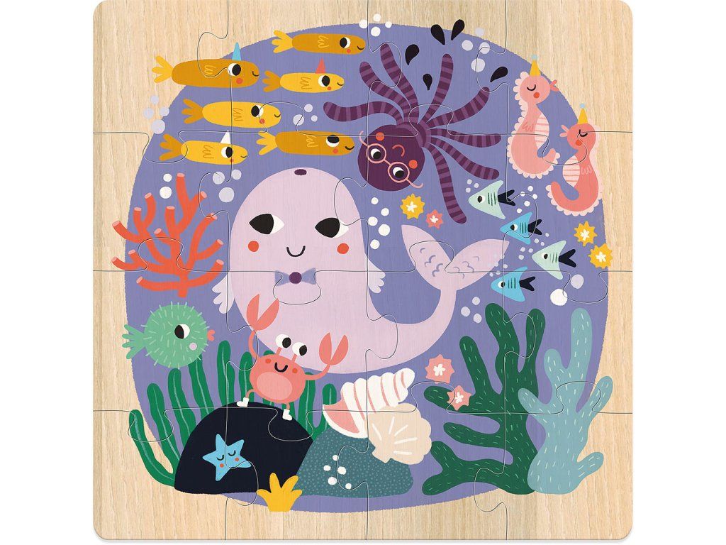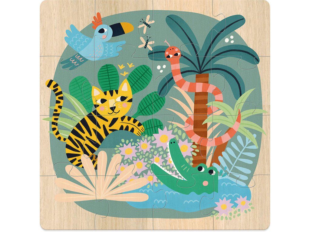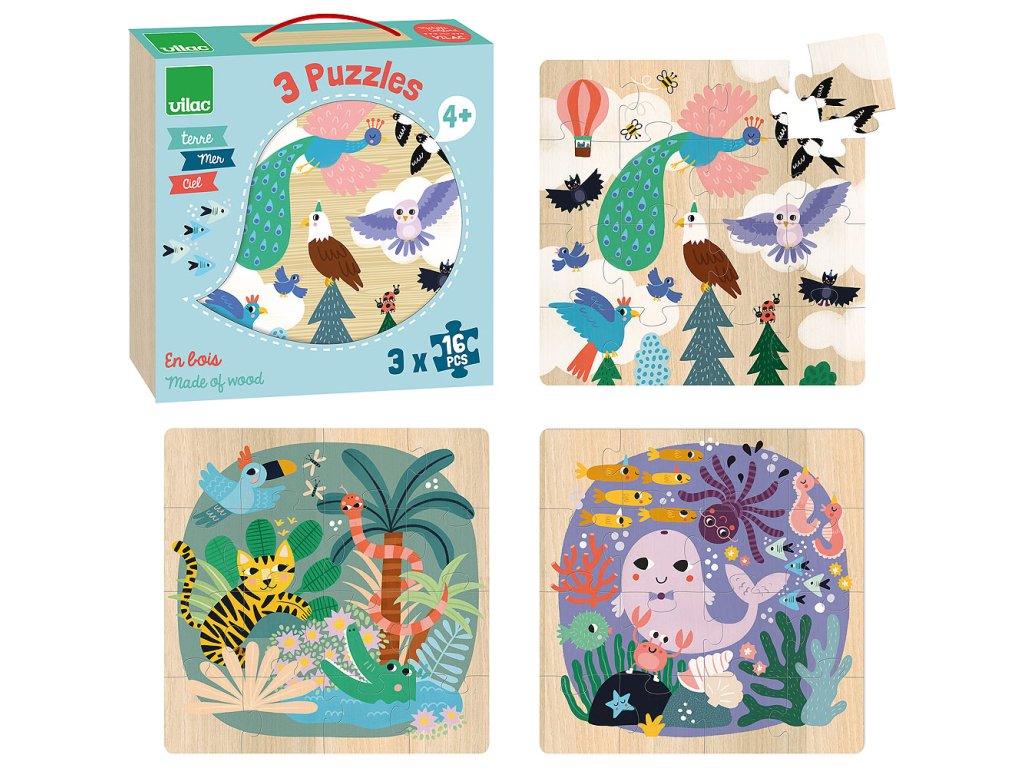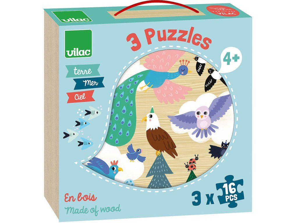 Sada 3 obrázkových puzzlí v praktické krabičce. Ilustrace Michelle Carlslund představují tři scény různých přírodních prostředí na souši, v moři a na obloze. Scéna v oblacích s velmi krásným pávem, orlem, sovou a dalšími různými ptáky. Další scéna ve vlnách s velkou velrybou, chobotnicí, mořskými koňmi a jejich přáteli rybičkami. Konečně poslední v džungli s tygrem, který se baví s krokodýlem, hadem a papouškem. Puzzle podpoří učení obratnosti a pozorování. Hlavní vlastnosti: obsahuje 3x16 dílků design Michelle Carlslund Cestujte s námi v naivním a elegantním světě dánské ilustrátorky Michelle Carlslund, světě jemných barev, který je plný roztomilých medvědů a přátelských ptáčků. V roce 2010, když Michelle ještě studovala grafický design, vytiskla doma své ilustrace a zkusila je prodat na designovém trhu, kde se setkaly s velkým úspěchem! Několik obchůdků chtělo začít prodávat její výtvory, a tak ji napadlo, že by bylo fajn začít podnikat. Michelle se rychle stala uznávanou nezávislou ilustrátorkou. Dnes lze její ekologická grafická díla zakoupit po celém světě v designových buticích, papírnictvích a dětských obchodech. Michelle se inspiruje vším kolem ní. Její výtvory jsou něžné a poetické, stylizovaný a dětinský styl, který se perfektně prolíná s hračkami firmy Vilac. „Jsem hranolky milující, časová optimistka a tvůrkyně ekologických plakátů a ilustrátorka na volné noze se sídlem v dánské Kodani,“ to by řekla ilustrátorka Michelle Carlslundová, kdyby se měla popsat jednou větou.