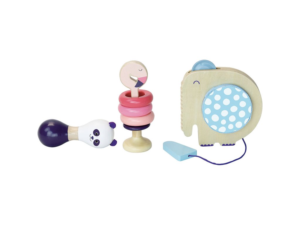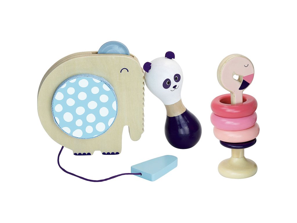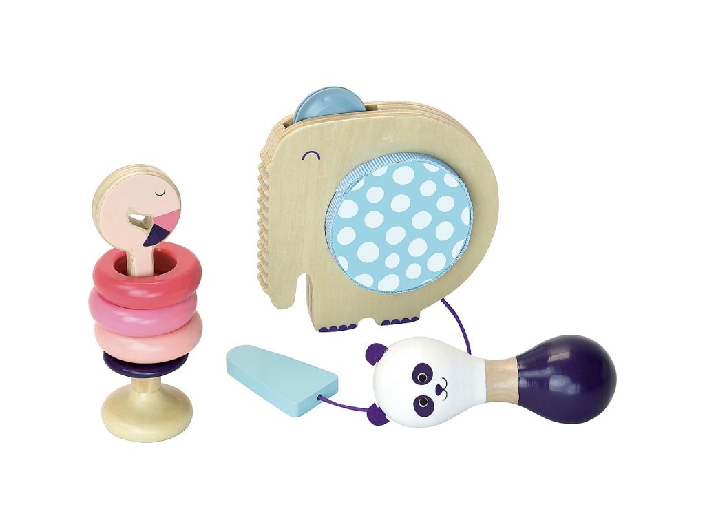 Krásná hudební sada pro nejmenší. Skládá se z barevné rumba koule pandy, sloní tamburíny a chrastítka plameňáka. Vhodné od 12 měsíců. Hlavní vlastnosti: podporuje lásku k hudbě a rytmikuobsahuje 3 díly