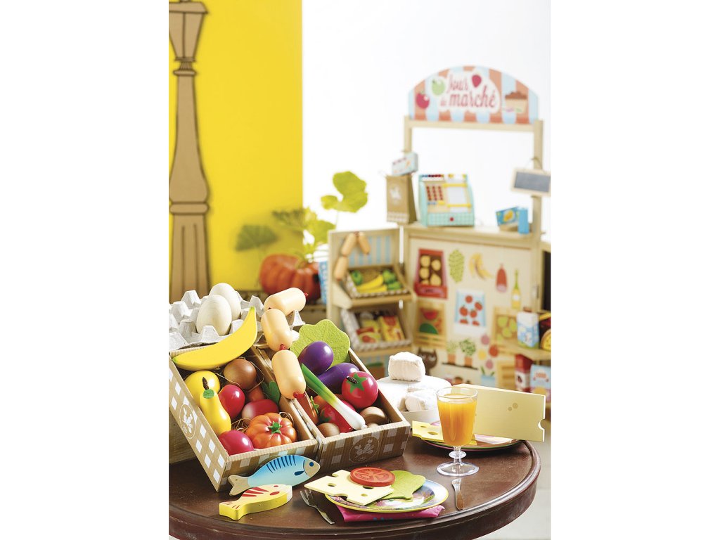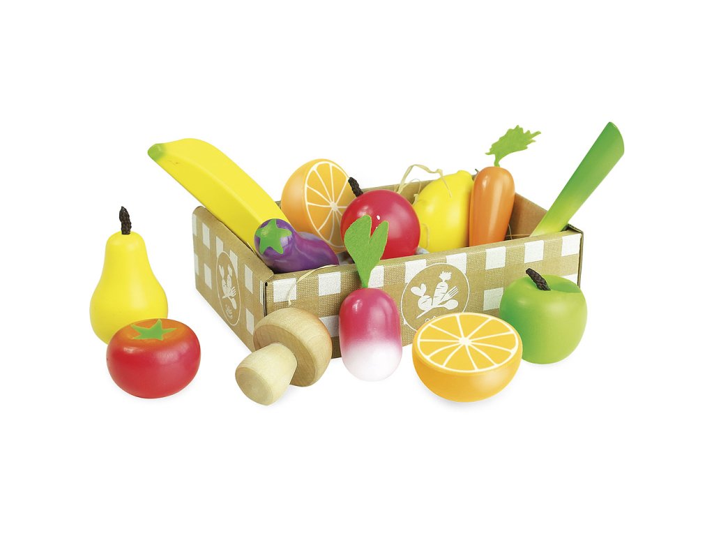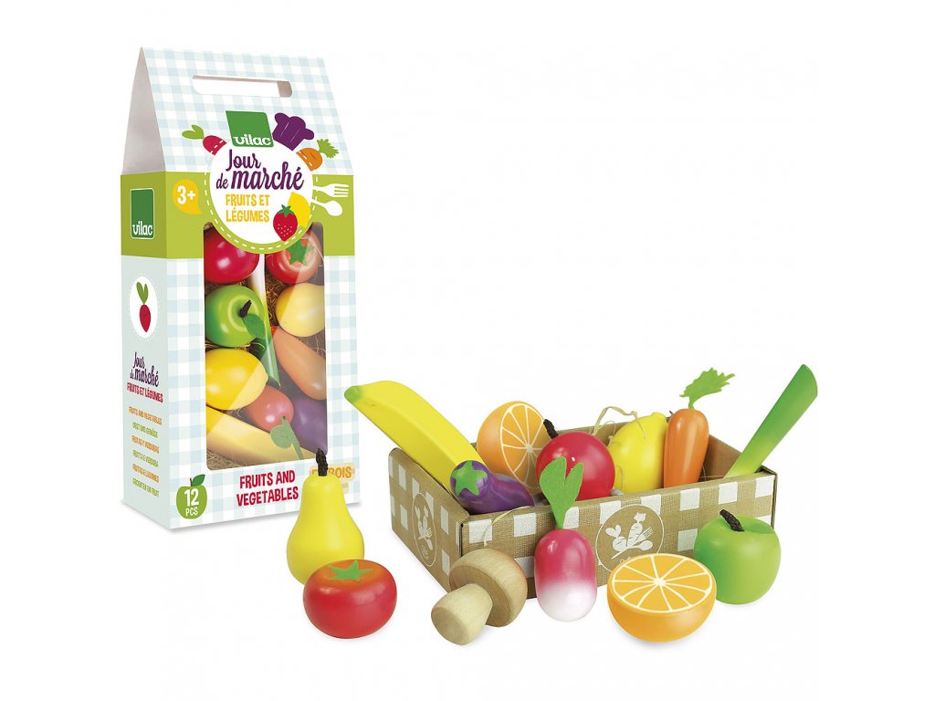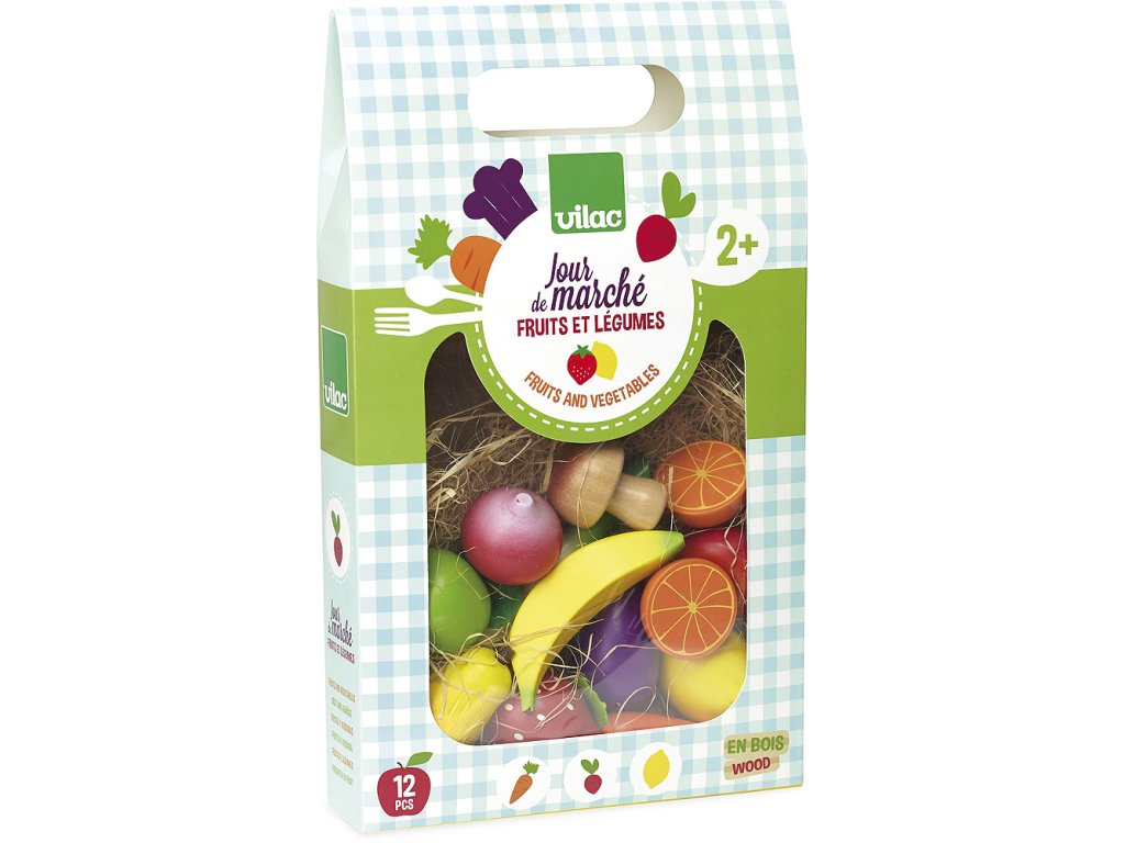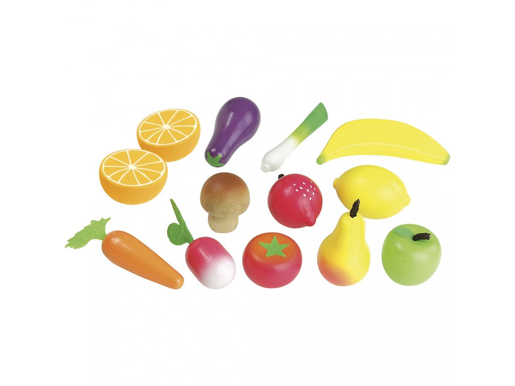 Sada ovoce a zeleniny, s kterou si děti mohou hrát na malé obchodníky na trhu. Pěkná lepenková krabice obsahuje mrkev, citron, ředkvičku, pórek, lilek, žampion, rajče, banán, jablko, hrušku, jahodu a dvě poloviny pomeranče. Ovoce je dřevěné s plstěnými doplňky. Hlavní vlastnosti: vhodné do každé kuchyňkypotraviny vyrobené ze dřevaobsahuje 12 ks