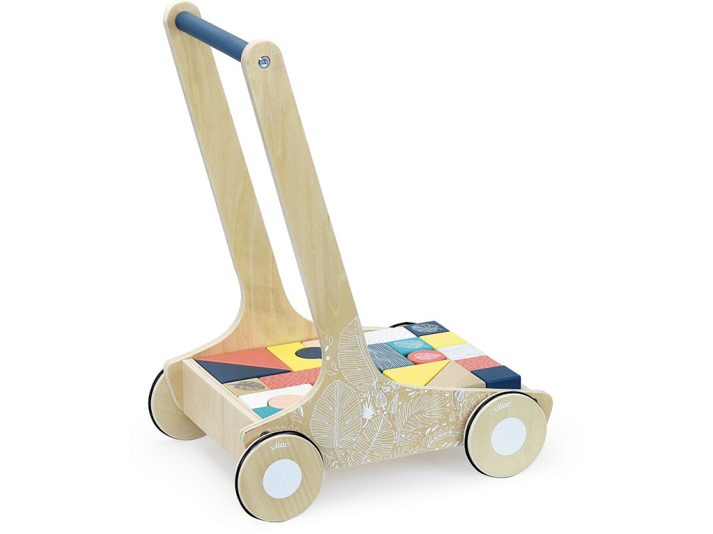 Dřevěný vozík s modrým madlem, bílou ilustrací a pogumovanými kolečky veze 24 kostek barevných i přírodních v různých tvarech. Děti podpoří při chůzi, hra s kostkami zase rozvine jejich prostorovou představivost. Vhodné od 12 měsíců. Hlavní vlastnosti: obsahuje 24 kostekmoderní barevný designvozíček a chodítko v jednompomáhá v rozvoji rovnováhy a motoriky dětí