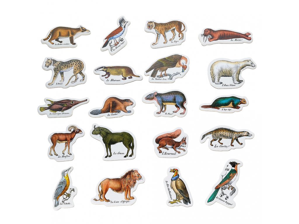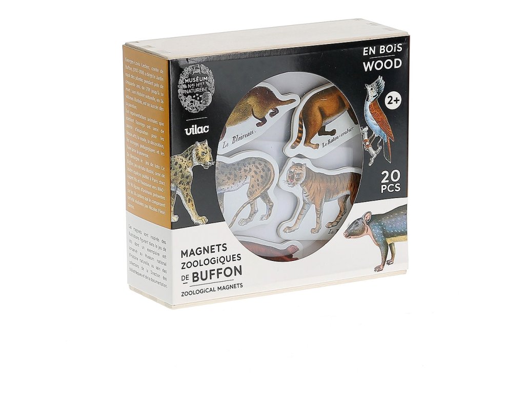 Dvacet dřevěných magnetků s motivem zvířat zoologické zahrady de Buffon. Vytvořeno ve spolupráci s přírodovědným muzeem v Paříži Museum national d’Histoire naturelle. Hlavní vlastnosti: obsahuje 20 ks magnetekbaleno v dřevěné krabičcevytvořeno ve spolupráci s Museum national d’Histoire naturelledekorační prvek vhodný do pokoje i na lednicivyrobeno ekologicky, šetrně k životnímu prostředí Spolupráce Vilac x Muséum national d'histoire naturelle (Národní přírodovědné muzeum) je novinkou roku 2023. Georges-Louis Leclerc, hrabě z Buffonu (1707-1788) byl intendantem královské botanické zahrady Francie bezmála 50 let, od roku 1739 do své smrti. Jeho dílo Histoire naturelle (historie přírody), v 36 ilustrovaných svazcích, mělo neobyčejný úspěch ihned po vydání. V knize obsažená zvířata byla inspirací pro výtvarná umění, módu, dekor, vzdělávací díla a dětské knihy. To dokazuje pexeso Buffon, ilustrovaná hra, vydána okolo roku 1840 v Paříži. Pexeso s 96 zvířaty na 24 kartách vyrobil Nicolas Fleuri Jannin. Reprodukovaná kopie je uložena v Národním přírodovědném muzeu v Paříži.