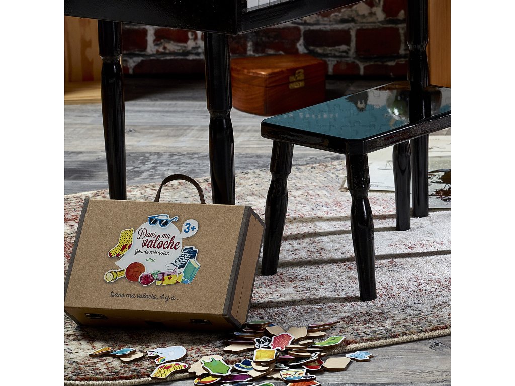 Vilac verze známé hry „Do mého kufru jsem vložil/a…“. Hráči si musí zapamatovat předměty, které postupně vloží do kufru, tato hra netrénuje pouze paměť, ale také hmat. Nezapomeňte ani na jeden předmět, malí cestovatelé, jinak budete ze hry vyřazeni! V balení 1 kartonový kufřík a 50 dřevěných dílků v textilním pytlíku. Hlavní vlastnosti: obsahuje 50 dílkůprohlubuje paměťové a smyslové dovednostiprocvičuje komunikační schopnosti a spolupráci Zkrácený návod hry:Začíná nejmladší hráč. Vybere si dílek (např. zelenou kšiltovku), vloží jej do kufru a ten zavře. Poté oznámí: „V mém kufru je zelená kšiltovka.“Další hráč zopakuje stejnou větu a přidá další dílek (např. červenou knihu): „V mém kufru je zelená kšiltovka a červená kniha.“Hráči se na tahu střídají, pokaždé zopakují, co už v kufru je a to od začátku, ve správném pořadí. Nakonec do věty přidají vlastní naposledy přidaný předmět. Pokud hráč udělá chybu, je vyřazen ze hry!Vítězí hráč, který zůstal ve hře jako poslední.