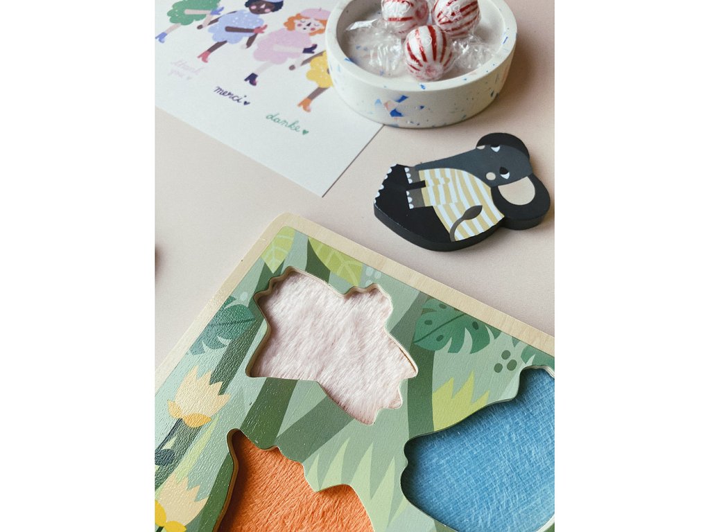 Pěkná senzorická vkládačka pro děti, plně dřevěná. Když děti z rámečku vyjmou dílek, objeví pod ním určitou látku, která má pod každým dílkem zvířete jinou texturu. Ilustrováno Michelle Carlslund. Hlavní vlastnosti: rozšiřuje smyslové vnímání dětíoriginální design Michelle Carlslundobsahuje 5 dílků Cestujte s námi v naivním a elegantním světě dánské ilustrátorky Michelle Carlslund, světě jemných barev, který je plný roztomilých medvědů a přátelských ptáčků. V roce 2010, když Michelle ještě studovala grafický design, vytiskla doma své ilustrace a zkusila je prodat na designovém trhu, kde se setkaly s velkým úspěchem! Několik obchůdků chtělo začít prodávat její výtvory, a tak ji napadlo, že by bylo fajn začít podnikat. Michelle se rychle stala uznávanou nezávislou ilustrátorkou. Dnes lze její ekologická grafická díla zakoupit po celém světě v designových buticích, papírnictvích a dětských obchodech. Michelle se inspiruje vším kolem ní. Její výtvory jsou něžné a poetické, stylizovaný a dětinský styl, který se perfektně prolíná s hračkami firmy Vilac. „Jsem hranolky milující, časová optimistka a tvůrkyně ekologických plakátů a ilustrátorka na volné noze se sídlem v dánské Kodani,“ to by řekla ilustrátorka Michelle Carlslundová, kdyby se měla popsat jednou větou.