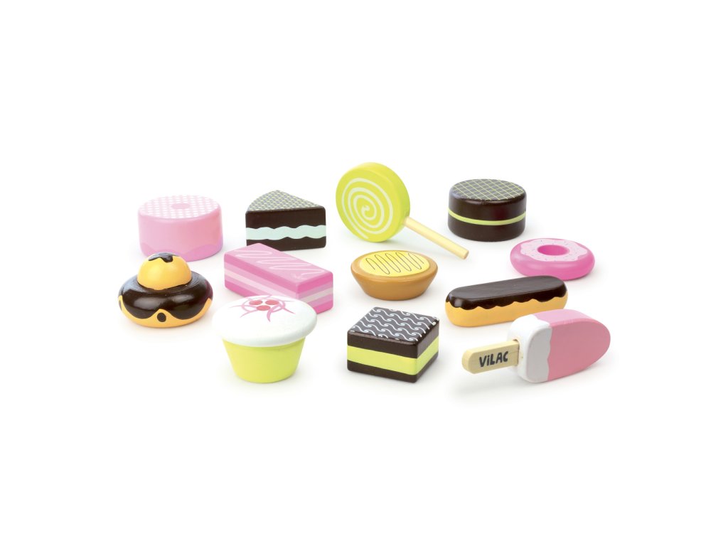 Tak jako opravdové sladkosti, i tyto dřevěné vypadají velice chutně. Balení obsahuje 12 ks zákusků a sladkostí. Hlavní vlastnosti: vhodné do každé dětské kuchyňkyobsahuje 12 ks