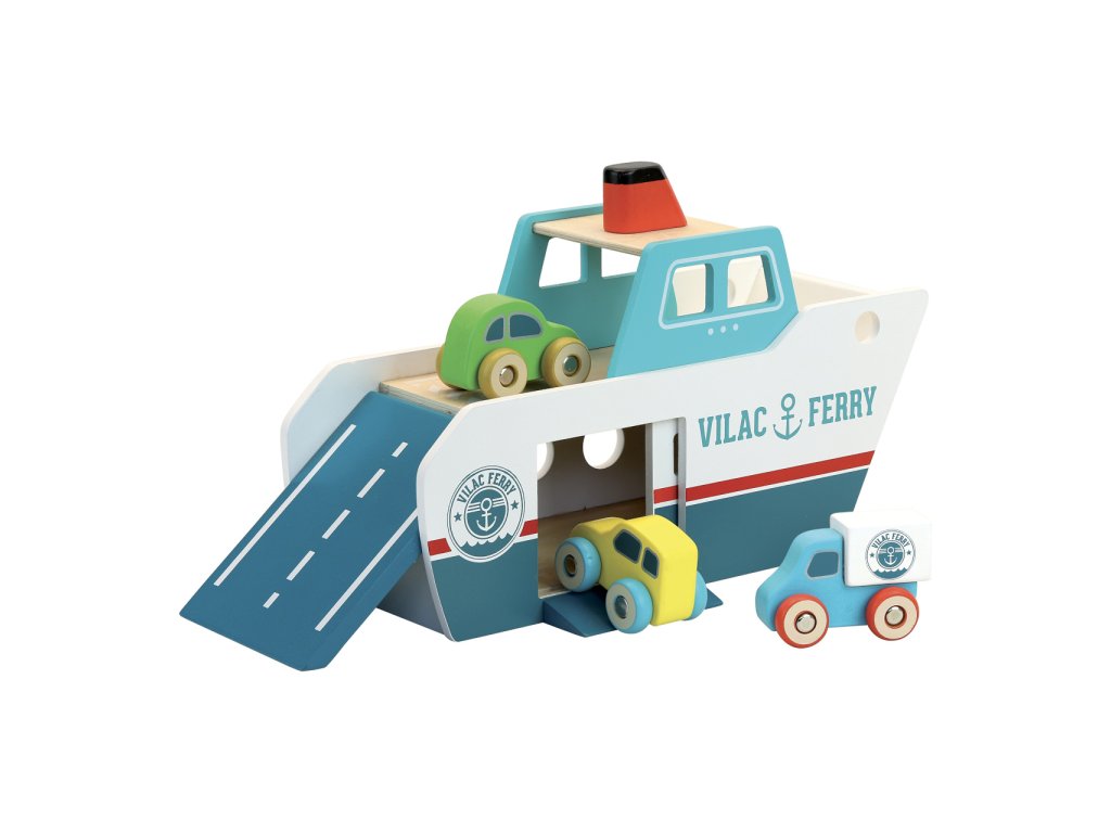 Vzhůru na palubu! Naloďte včas všechna autíčka a překonejte trajektem řeku, nebo moře. Loď je vybavena posuvnými dveřmi, za kterými se ukrývá prostorné podpalubí s parkovištěm. S pomocí sklápěcí rampy lze pak řidičům zpřístupnit i horní palubu. Součástí balení je hned několik různých autíček, která mohou děti bezprostředně přepravovat. Hračka vyniká vybranou barevností, díky které vkusně doplní interiér dětského pokojíčku. Neváhejte a doplňte ji dále o Malou garáž Vilacity, se kterou tvoří harmonickou kolekci. Vyrobeno z odolného masivního dřeva a silné překližky. Hlavní vlastnosti:trajekt a 3 autíčkaposuvné postranní dveře a sklopná rampajedinečný designrobustní a odolné provedení